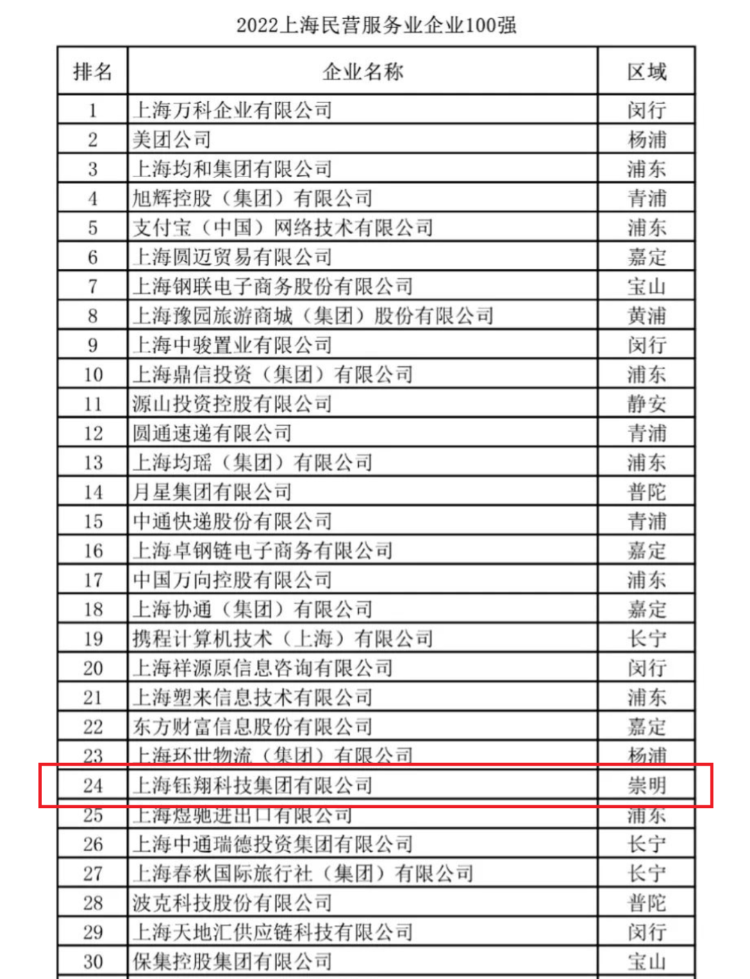 上海鈺翔科技集團有限公司憑借卓越的綜合實力、持續提升的科技創新能力,2021年實現營業收入119.5億元,榮獲“2022上海企業100強第88名”、“2022上海民營企業100強第40名”、“2022上海服務業企業100強第46名”、“2022上海民營服務業企業100強第24名”四項榮譽。