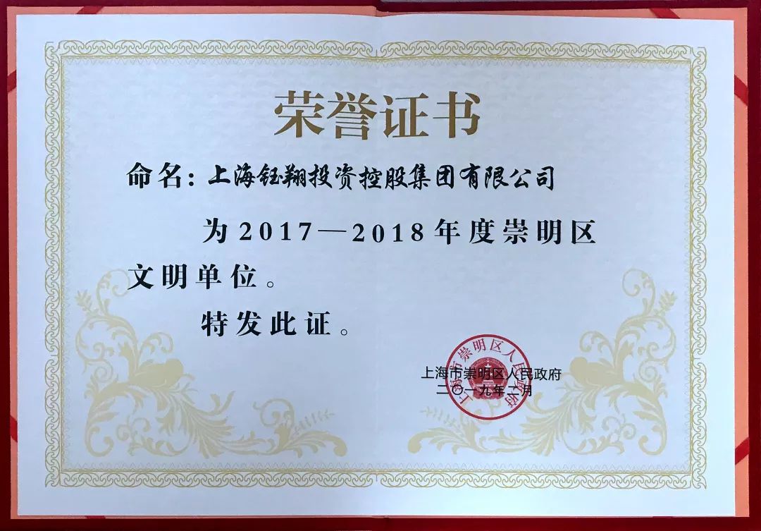 近日,鈺翔控股集團再次被評為上海市崇明區文明單位,截至目前,鈺翔控股集團已經連續榮獲第十七屆(2013—2014年度)、第十八屆(2015—2016年度)上海市文明單位榮譽稱號,目前正在積極參評第十九屆(2017—2018年度)上海市文明單位。
